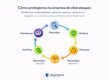 Zentrya Security nace de la experiencia práctica en gestión de vulnerabilidades y parchado de sistemas en entornos corporativos, aplicando metodologías utilizadas en organizaciones reales.
